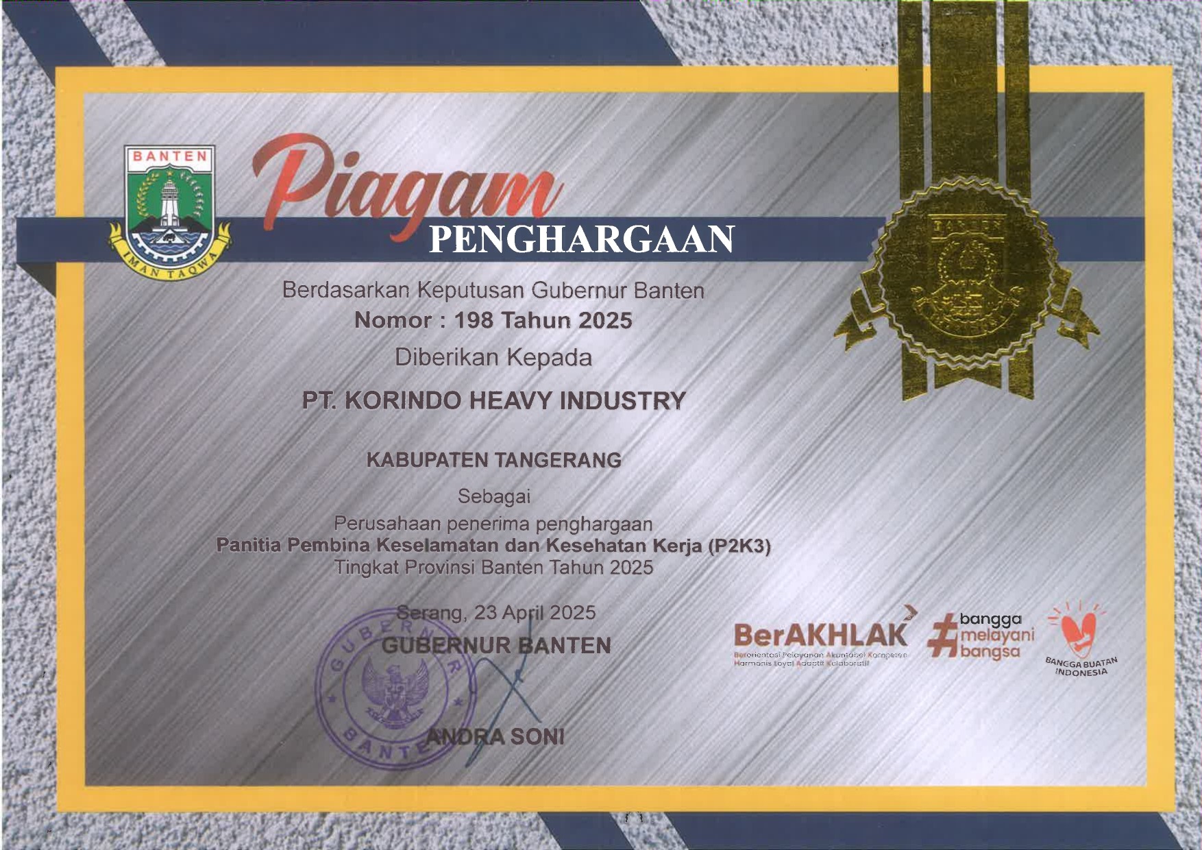 BALARAJA – PT Korindo Heavy Industry (KHI) meraih penghargaan Keselamatan dan Kesehatan Kerja (K3) Awards 2025 yang diselenggarakan Dinas Tenaga Kerja dan Transmigrasi (DISNAKERTRANS) Provinsi Banten, pada April (23/4) lalu.