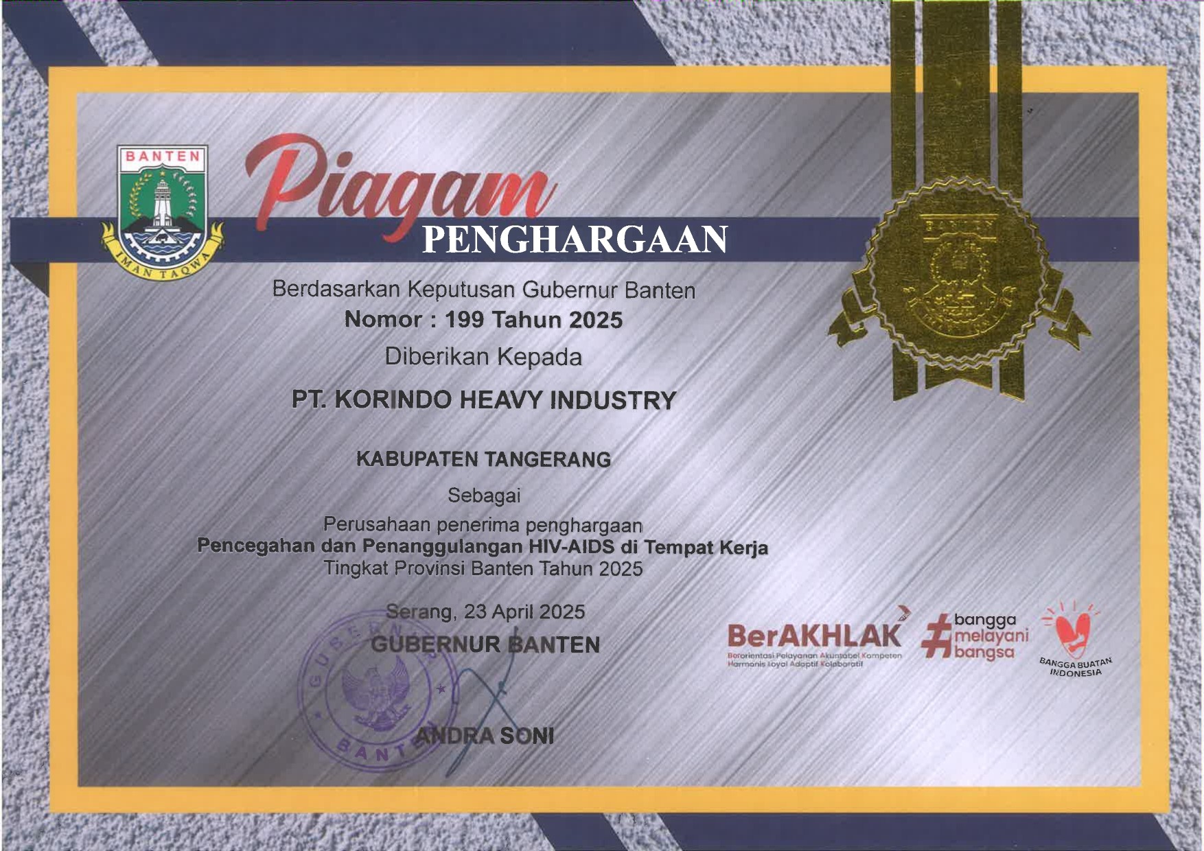 Foto: Piagam penghargaan Pencegahan dan Penanggulangan HIV AIDS di Tempat Kerja tingkat Provinsi Banten kepada PT Korindo Heavy Industry