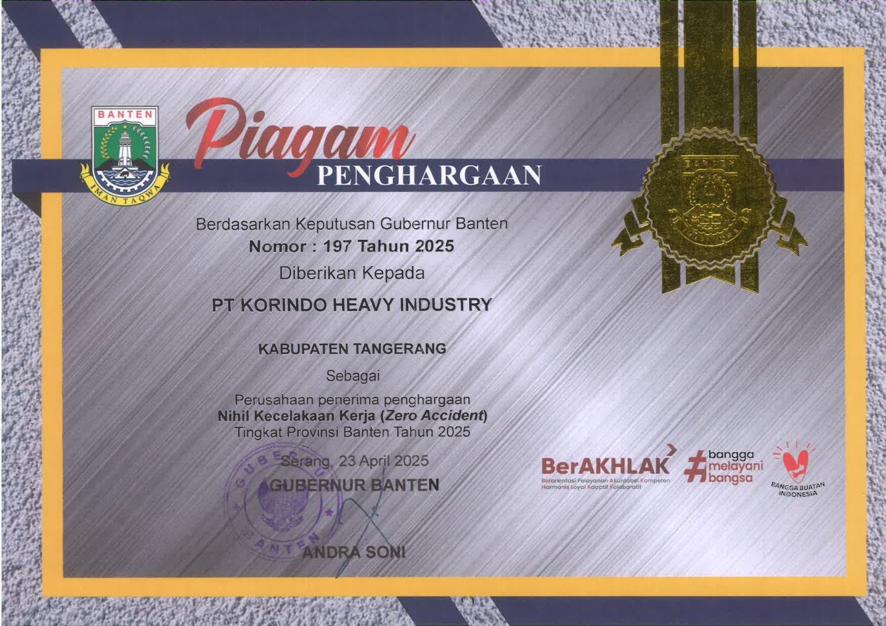 Foto: Piagam penghargaan Zero Accident atau Kecelakaan Nihil tingkat Provinsi Banten kepada PT Korindo Heavy Industry